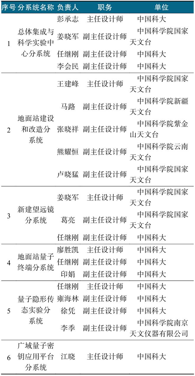 “墨子号”项目采用了“首席科学家+工程两总”的管理模式,首席科学家由潘建伟担任,工程总设计师为徐博明,总指挥为阴和俊。首席科学家负责科学目标的实现,主要职责包括:负责提出和策划整个专项的发展战略规划、科研方向和目标、研究任务分解方案;统筹安排各项目之间的协同创新;批准专项主要研究人员的聘用;提交年度报告和接受评估及专项调节经费的调配使用。工程总设计师负责组织和实施量子通信卫星系统的工程化、领导和指挥关键技术攻关,组织编制系统总体管理规范,批准专项研制流程,提交年度报告和接受评估。总指挥是整个任务的领导核心,负责确保卫星规划、发射、运行和维护的全过程顺利进行。此外,该卫星项目特别设立了项目总体组,专门负责“天地一体化实验”的总体规划与实施。